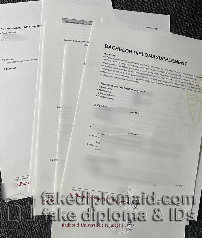 How to obtain your RU Nijmegen diplomasupplement online? Faking RU Nijmegen diplomasupplement, what is difference RU Nijmegen diploma supplement VS RU academic transcript?Radboud University’s coat of arms was designed at the time of the founding of the university by the goldsmith workshop of the Brom family in Utrecht. The lower part represents the coat of arms of the Catholic Church in the Netherlands. Buy Netherlands University degrees, making Netherlands RU diploma supplement. The dove in the upper part of the coat of arms is the symbol of the Holy Spirit. The entire shield is surmounted by the Imperial Crown of the Holy Roman Empire because Nijmegen was once home to Frankish King Charlemagne. Underneath the coat of arms one finds the university’s motto “In Dei Nomine Feliciter”, meaning “happily in the name of God”. The coat of arms is used on most of the university’s official documents, including the university’s bachelor, master and PhD certificates. For 2023 a special version of the coat of arms was designed to celebrate Radboud University’s 100 year anniversary.The Keuzegids Universiteiten issued by the National University Student Survey Center every year is the official undergraduate professional ranking and school selection guide in the Netherlands. According to the 2015-2016 ranking results, the University of Nijmegen has 12 undergraduate majors ranked first in the Netherlands (Eerste plaats), Including Art and Cultural Studies, Dutch Language and Culture, Romance Language and Culture, Linguistics, Education, Political Science, Public Administration, Religion, Sociology, Biology, Chemistry, Dental Medicine. Among them, art and cultural studies, political science, chemistry, and dental medicine were also awarded the title of Top Professional in the Netherlands (Topopleiding). RU diploma supplement maker, copy a RU student transcript online.